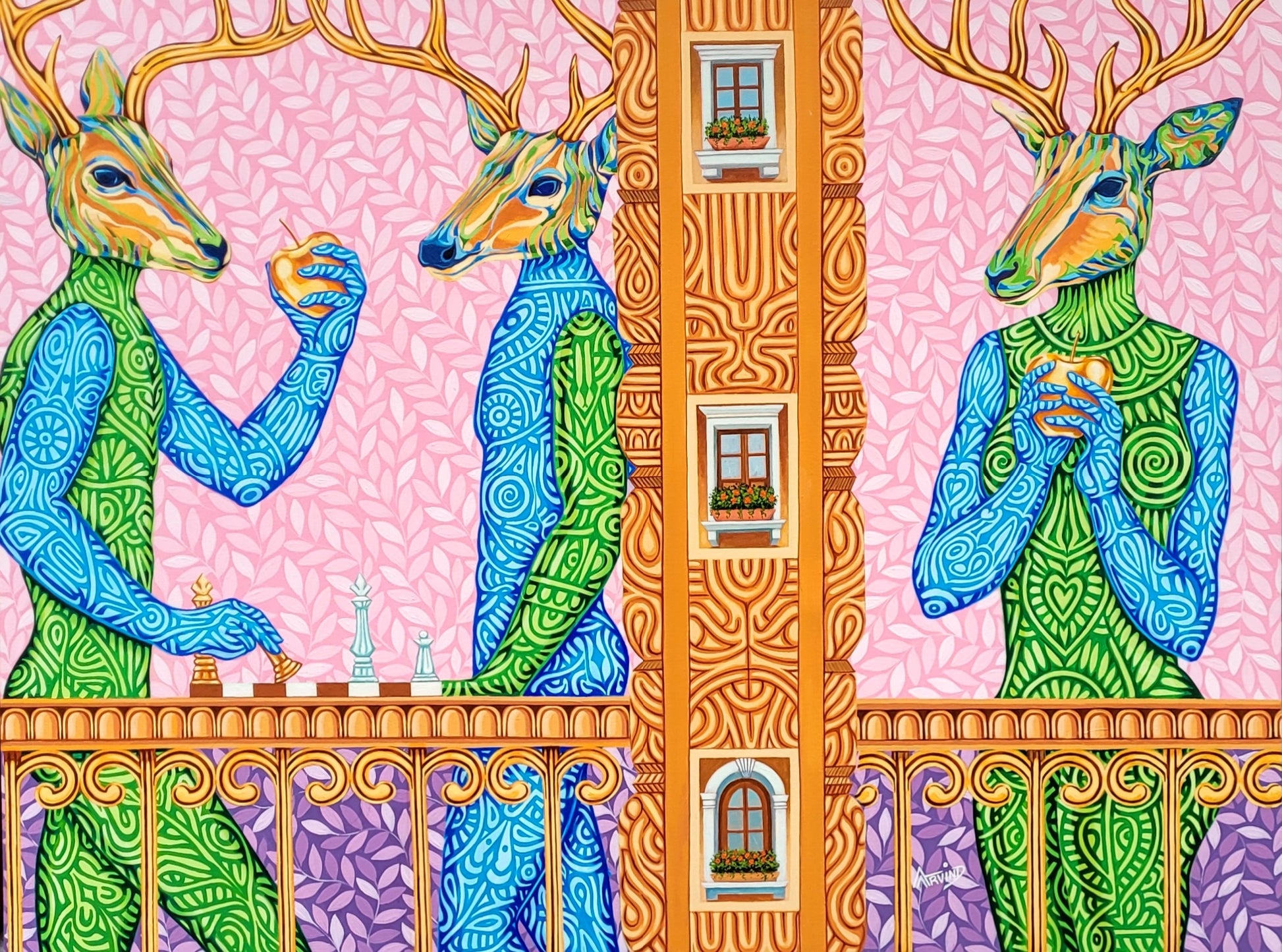 In this work I have tried to show the feelings, dreams love and hope. All three character are admiring each other. It’s a scene of balcony where they used to see each other.