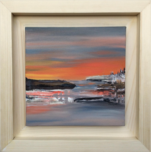 Acrylic abstract landscape capturing a tranquil dawn, soft orange and gray sky mirrored over peaceful reflective water