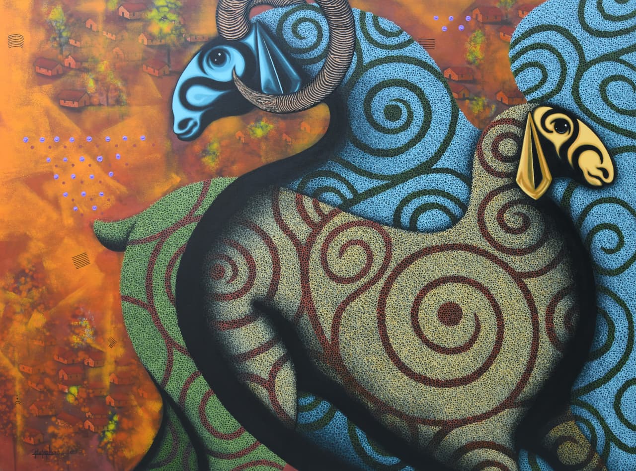 Pratap S. Kore’s work traces the journey of connection between people, animals, and nature. Influenced by his roots in the nomadic Dhangar community, his paintings reflect the harmony of shepherd life and the beauty of shared existence. Through his art, Pratap invites viewers to experience the wilderness, family bonds, and the quiet hope found in everyday moments.