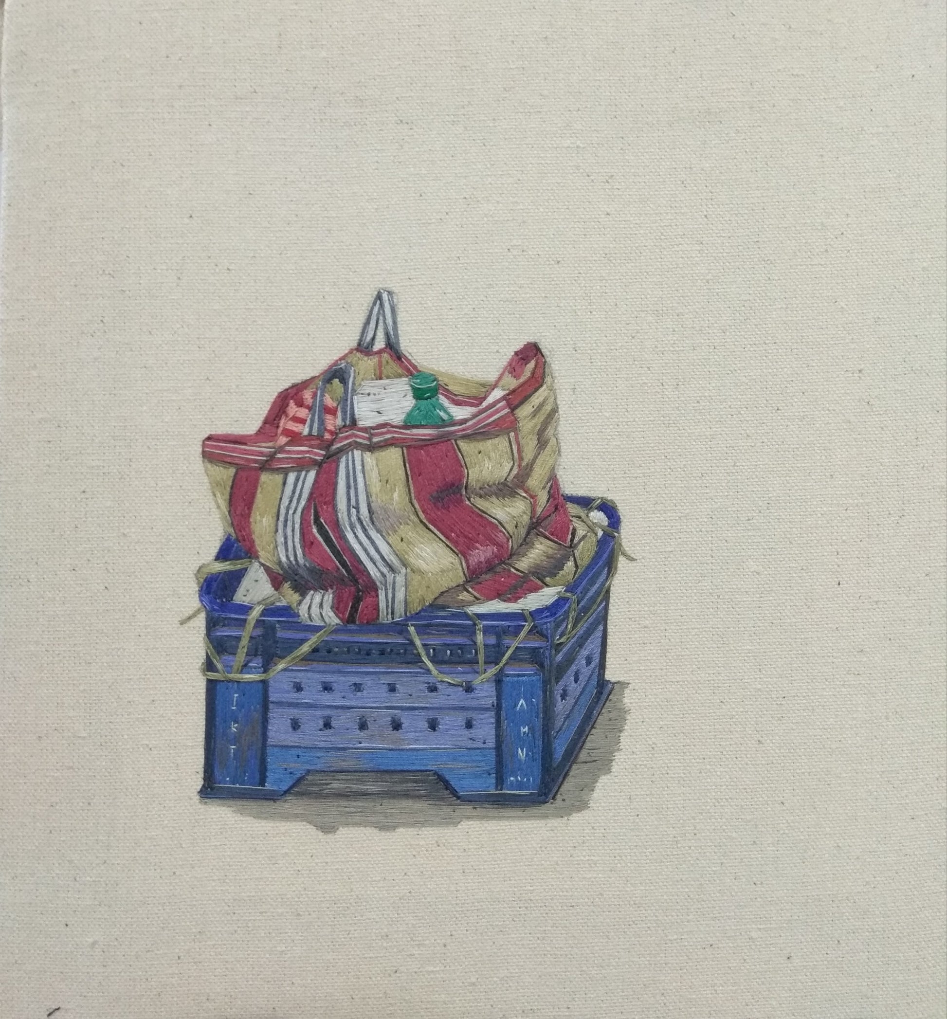 Sandipan Acharjee uses images from markets, train vendors, and stations to create embroidery artwork. His recent works, such as "End of the Day," were inspired by the Sealdah Koly market. Acharjee sees thread as a symbolic representation of both existence and hope.