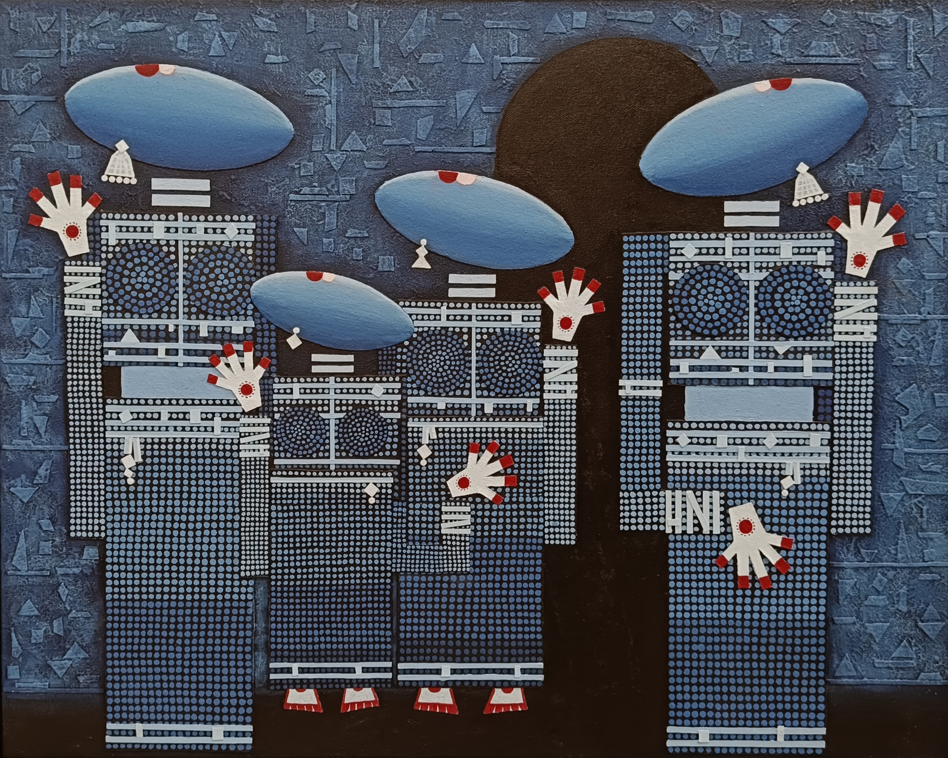 In this painting titled "Gossips", I have portrayed two elder and two young goddess-like female figures standing outside the traditional home entrance, engaged in a moment of conversation. The work draws inspiration from rural and tribal life, where everyday interactions hold symbolic significance. I have used my signature cut-and-paste technique, combining pieces of canvas and paper to construct the forms. To bring out depth and tactile rhythm, bindis have been applied by hand to create intricate textures. This composition reflects both the sacred and the ordinary, blending divine feminine energy with familiar scenes from community life
