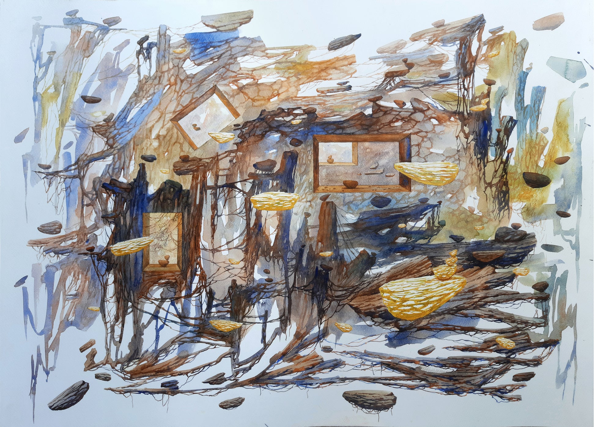 Most of my works have been influenced by my travels to varied places. They are also a reflection of my childhood memories of staying in Patiala, Punjab. The iconic ‘Qila Androon’ literally translated as 'the inner fort', which is now in a dilapidated state, is symbolized through the remains of rocks and stone in my watercolour paintings.