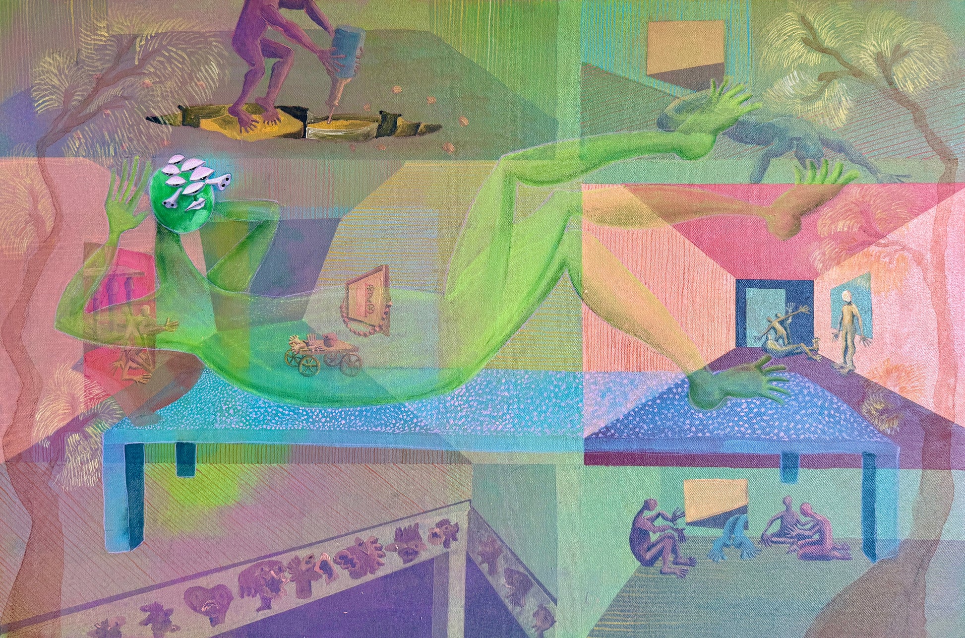 This painting portrays a reclining human figure, seemingly at ease, floating above layered scenes of construction, conflict, and discomfort. The vibrant background reveals fragmented narratives of work, social tensions, and environmental decay, yet the central figure remains detached, lost in the illusion of peace. The work mirrors a common reality: the tendency to ignore surrounding problems while believing ourselves safe or unaffected. It's not just a personal escape but a collective condition, a reflection on denial, privilege, and the quiet violence of disengagement in today’s world.