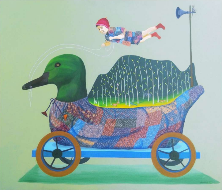 As the title of the painting suggests, this painting captures a child's dream. The child wants to immerse himself in nature. The child has built his dream in his traditional Channapatna toy.