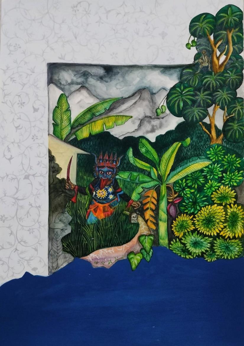 Kali represents Shakti, the power of energy and creation. Near my place, Kali masks are often worn by people, showing her strong and living presence. In my paintings, I use the image of Kali as a metaphor. For me, she is not only a goddess but also a symbol of strength, transformation, and the hidden power within everyday life. By using Kali in this way, I connect tradition with my own artistic language. She becomes a bridge between the past and the present, between myth and reality. Through her image, I want to express both fear and protection, destruction and creation, and the cycles of life that continue to renew themselves.