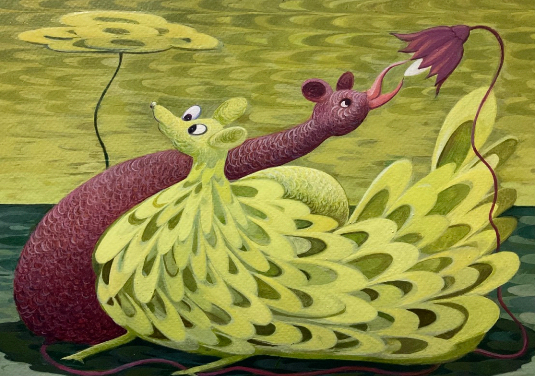 The two bird-like figures dance in playful exchange. Their forms are abstract yet familiar: elongated necks, Feathered textures hinted at through delicate brushwork, and eyes filled with wonder. Here, the bird eats the seed from the flower, unaware that it grows from within itself. Its playfulness masks a profound truth: the substance it seeks, the source of life and joy, is born from within.