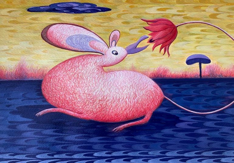 This painting is rendered entirely in soft, translucent brushstrokes, where the boundaries between body and background are gently diffused. The figure is curled into itself in a quiet, meditative position, eating seeds from a flower that grows from its own tail. This act mirrors the Kasturi Mriga — seeking outward but nourishing inward.