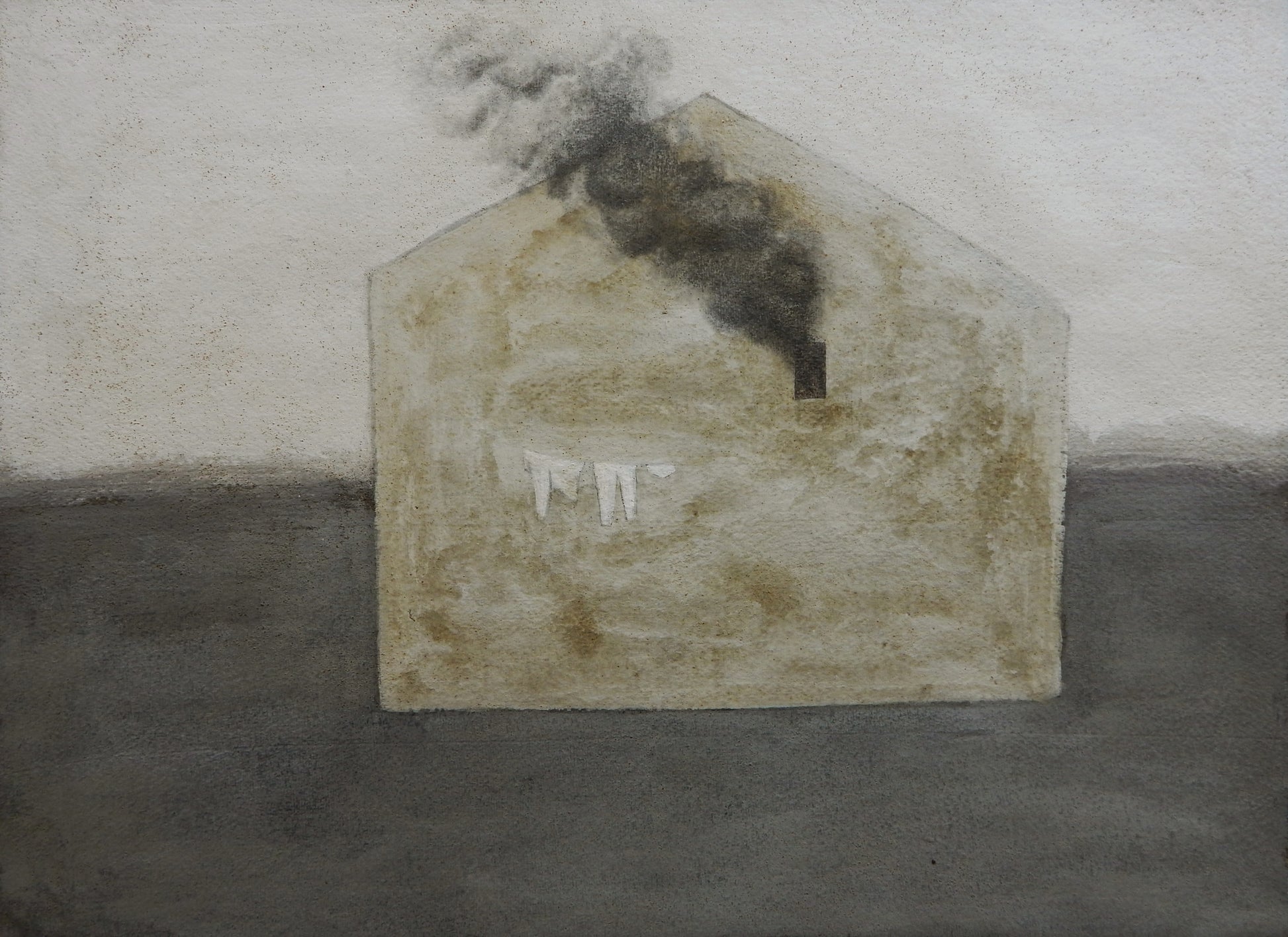 The Last attempt is inspired by the final fate of a government job aspirant. The picture shows the of a house in a foggy landscape, with black smoke coming out of the window. Clothes are hung to dry on a rope tied to the wall of the house. This Painting conveys a sense of apprehension. The black smoke used as a symbol of apprehension.
