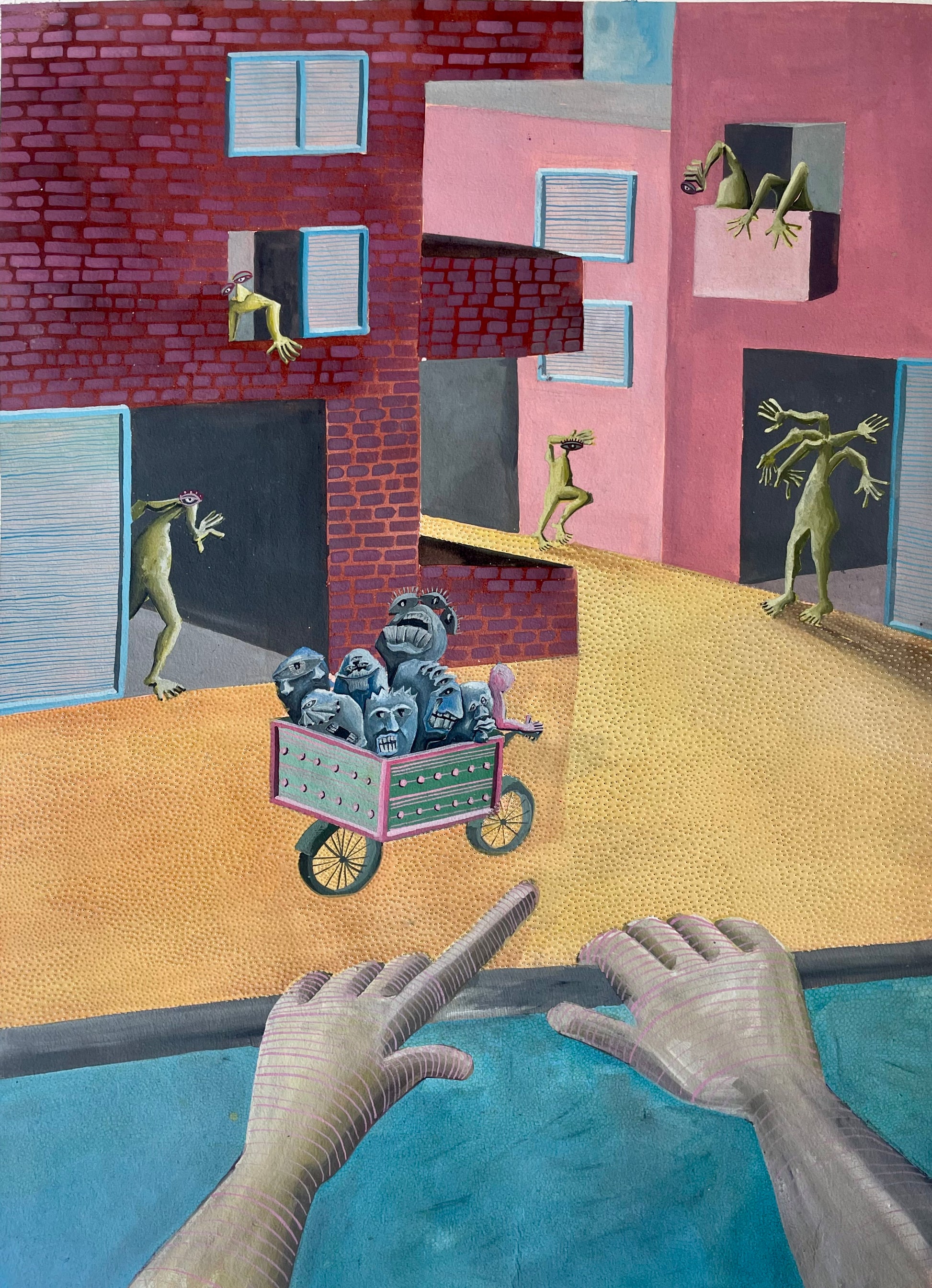 This painting imagines a surreal future where even human heads are delivered like goods a commentary on how everything is becoming commodified. Inspired by the rise of doorstep delivery culture, it reflects a darker possibility where identity, emotion, and even human presence are packaged and sold. The multiple heads represent how people shift expressions and personalities to fit different situations, wearing different faces as needed. The painting questions what remains authentic in a world that constantly demands change and convenience.