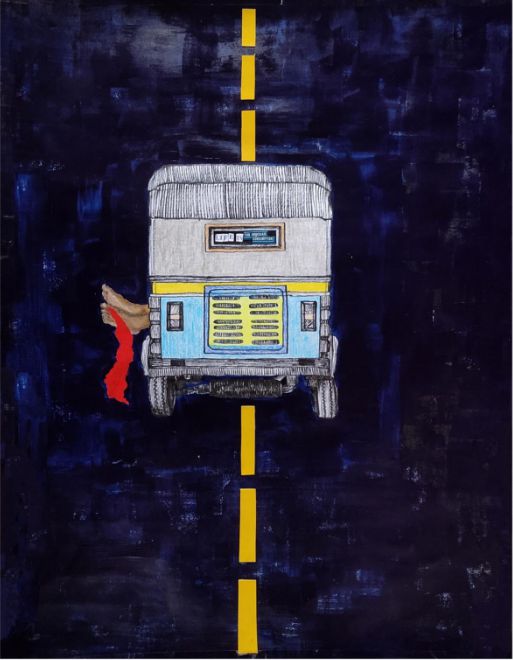| Medium | Acrylic, oil pastel, marker pen and waste material on paper |