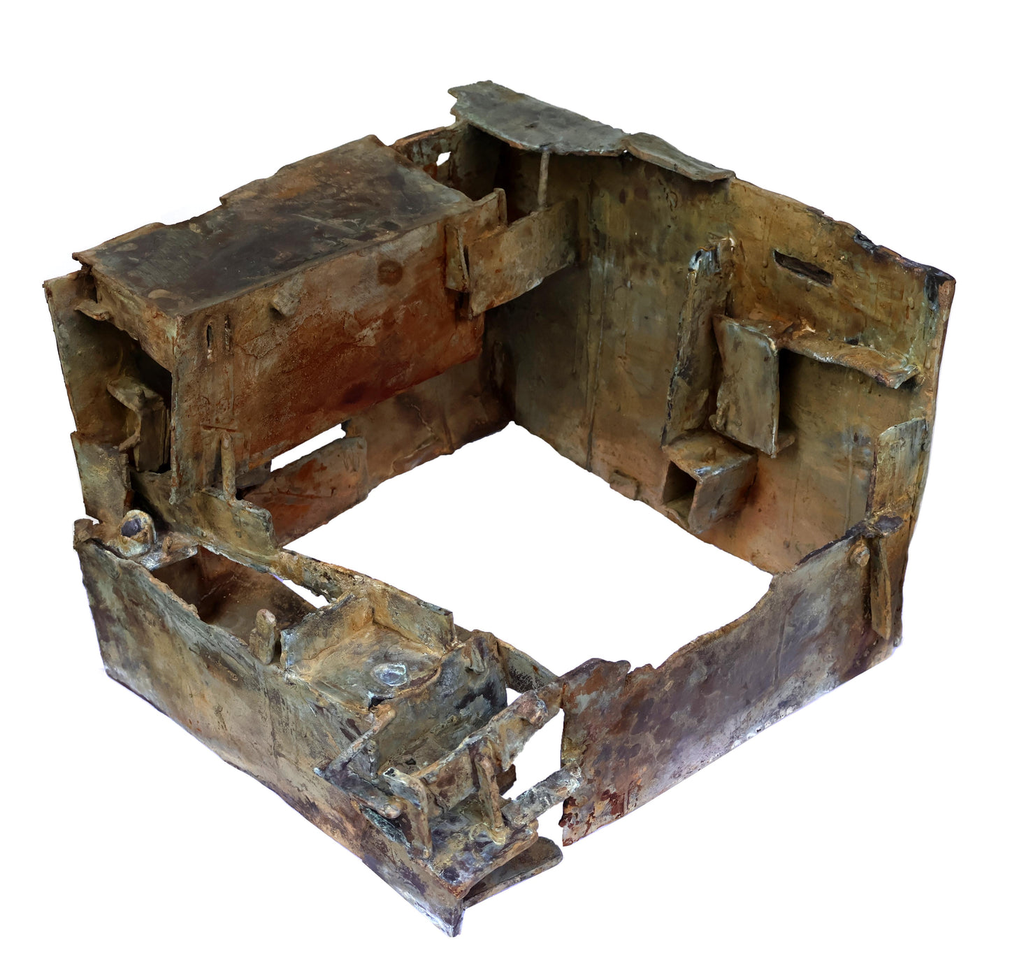 Satyendra Kumar, a sculptor, finds that wood and metal complement each other well in his work. He uses various wooden planks, some of which have their own sculptural qualities, combining them with one another. He prefers using older pieces of wood with unique textures, irregular shapes, and remnants of paint. When working with metal, he primarily constructs his pieces using wax strips.