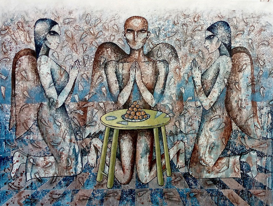 Upon finishing my art education, I began an intense quest to find my own flair in creating figures and blending colours. ‘Red’, my first show, was an experimentative series of different shades of red - vermillion, scarlet, crimson and maroon - using acrylic on handmade paper. The experiment was figurative as well as abstract. The appreciation I had received inspired me to work on two more series, ‘Blue’ and ‘White’. ‘Blue’ used oil on canvas and predominantly had cobalt, marine, Prussian s... Read More