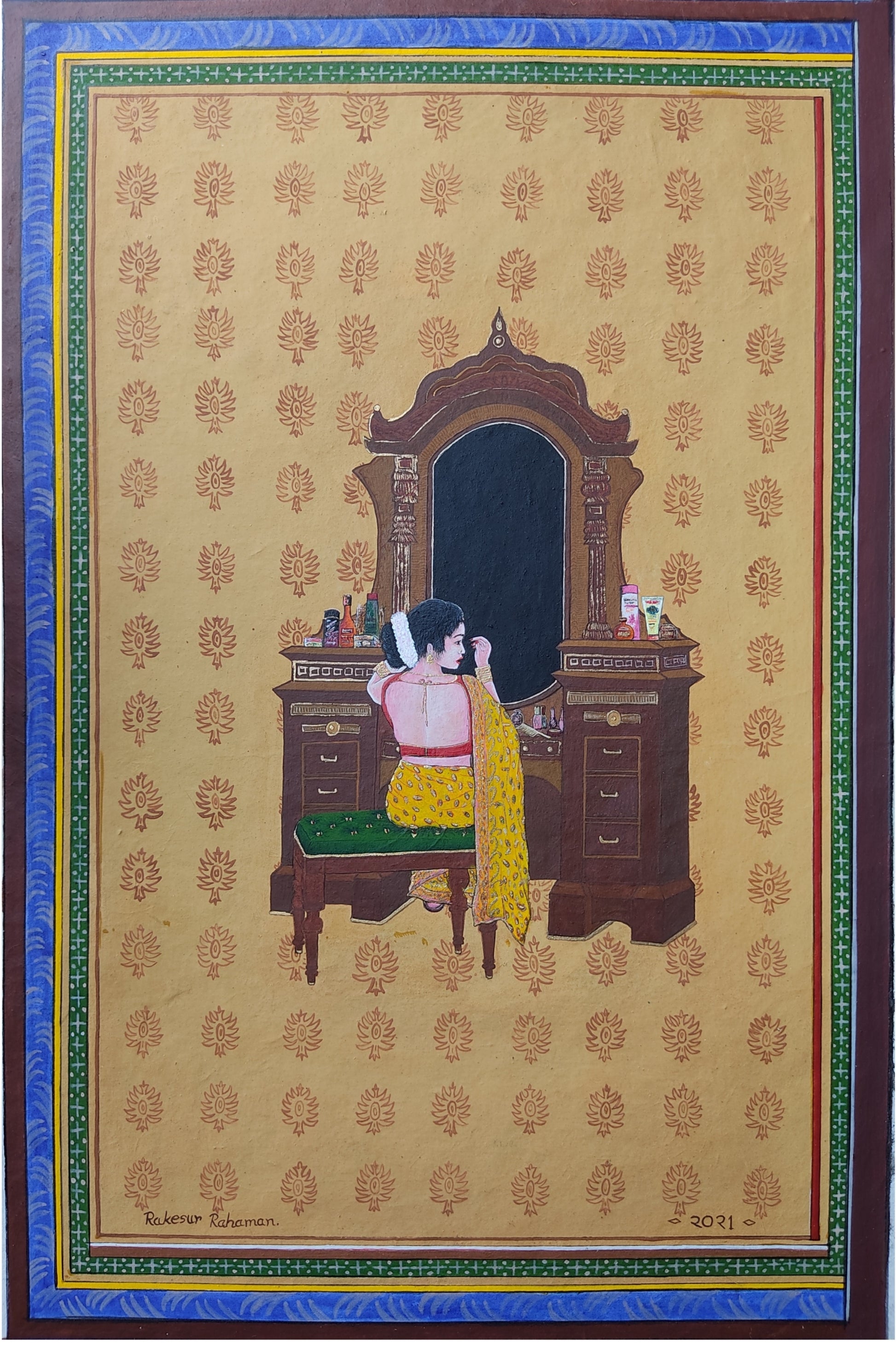 The Lady captures an intimate, timeless moment of self-reflection, where tradition and contemporary life quietly converge. At the heart of the composition, a woman sits before her ornate dressing table, absorbed in the simple yet profound act of adorning herself. Her sari, rich in yellow patterns, drapes with elegance, its folds echoing the delicacy of her gesture. The finely detailed wooden mirror—dark, silent, and unreflective—becomes less a literal object and more a metaphorical presence. It suggests the unseen dimensions of identity, the interior life that resists surface capture. The surrounding patterned background, recalling miniature traditions, transforms the domestic space into one of rhythm and harmony, where ornament itself becomes part of the narrative. What is beautifully arranged here is not only the balance of colors, textures, and forms, but the balance of eras: the traditional grace of the lady and her attire, juxtaposed with the unmistakably modern cosmetic bottles that line the table. Through this subtle interplay, the work reflects on continuity and change, on how beauty, care, and self-presentation remain eternal concerns, shaped differently in each age. The painting is at once a portrait of a single figure and a meditation on the evolving rituals of femininity, delicately poised between memory and modernity.