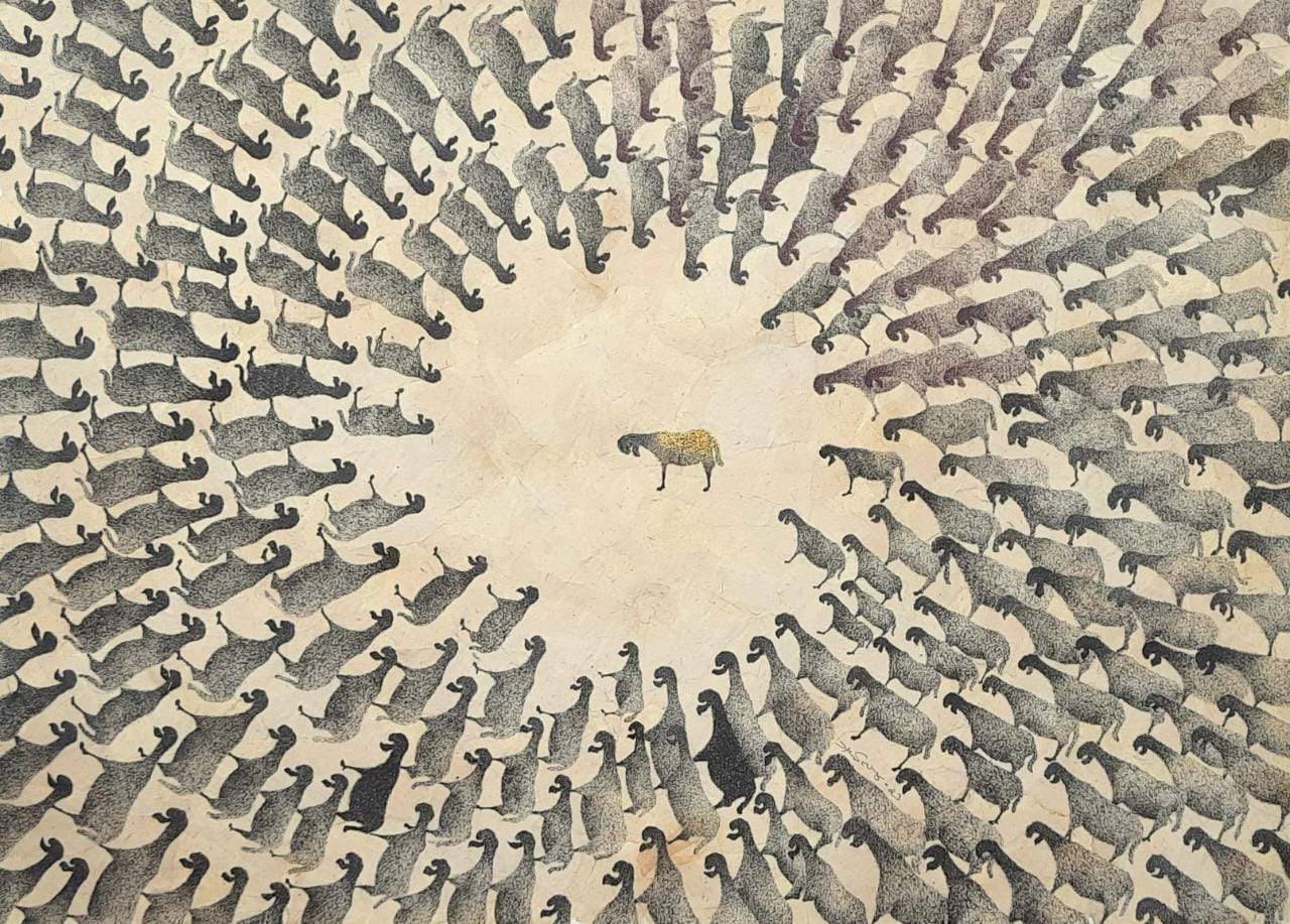 Always surrounded by domestic animals since childhood, I am fascinated by their form, style and endearing nature and frequently depict the animals in my work. I am from a very rural area in Gir, so my day-to-day life and also try to represent current scenarios of politics and emotional realms of pain or joy through my work.