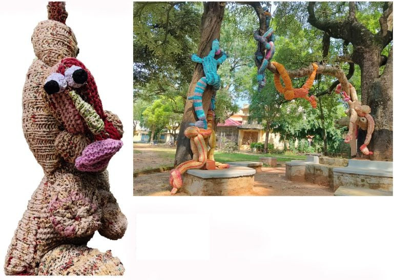 Here, my attention turns to the disappearing world of childhood play. The mental snapshot of children playing on tree stumps is striking in my recollection as it encapsulated the joy and unbridled exuberance of my youth. Wistfully, the earth-bound games fell to the status of relics of the past because of the ceaseless pull of technology. With my sculptures, I aim to preserve these recollections and the boundless connection with nature and spirit imagination. With the use of different textures and techniques in the recycled cloth, I aim to summon the roughness of the bark, movement of the leaves, and the energy children exude when they are in their element. This chapter is both an homage and a gentle critique of the culture shift.