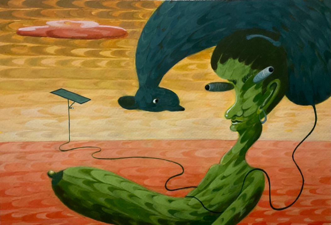 This painting bursts into view with a palette dominated by hard, muted oranges and industrial greens – a landscape baked in surreal Heat explores tension and quiet myth. A female figure standing with a rat-like form seated on her head may symbolize conditioning, ego, or external systems that control perception. Its tail’s connection to the solar plexus creates a powerful reversal of the Kasturi metaphor — here, the seeker’s inner guide is subtly wired to an external source of enlightenment.