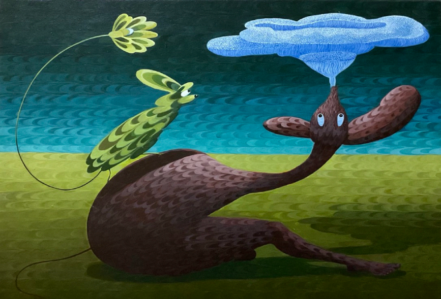 The entire canvas is painted in soft, illusory brushstrokes. A large figure is shown blowing a flower from its mouth, as if releasing something sacred — perhaps its own inner fragrance. The work also reflects a quiet dialogue unfolding within the painting itself.