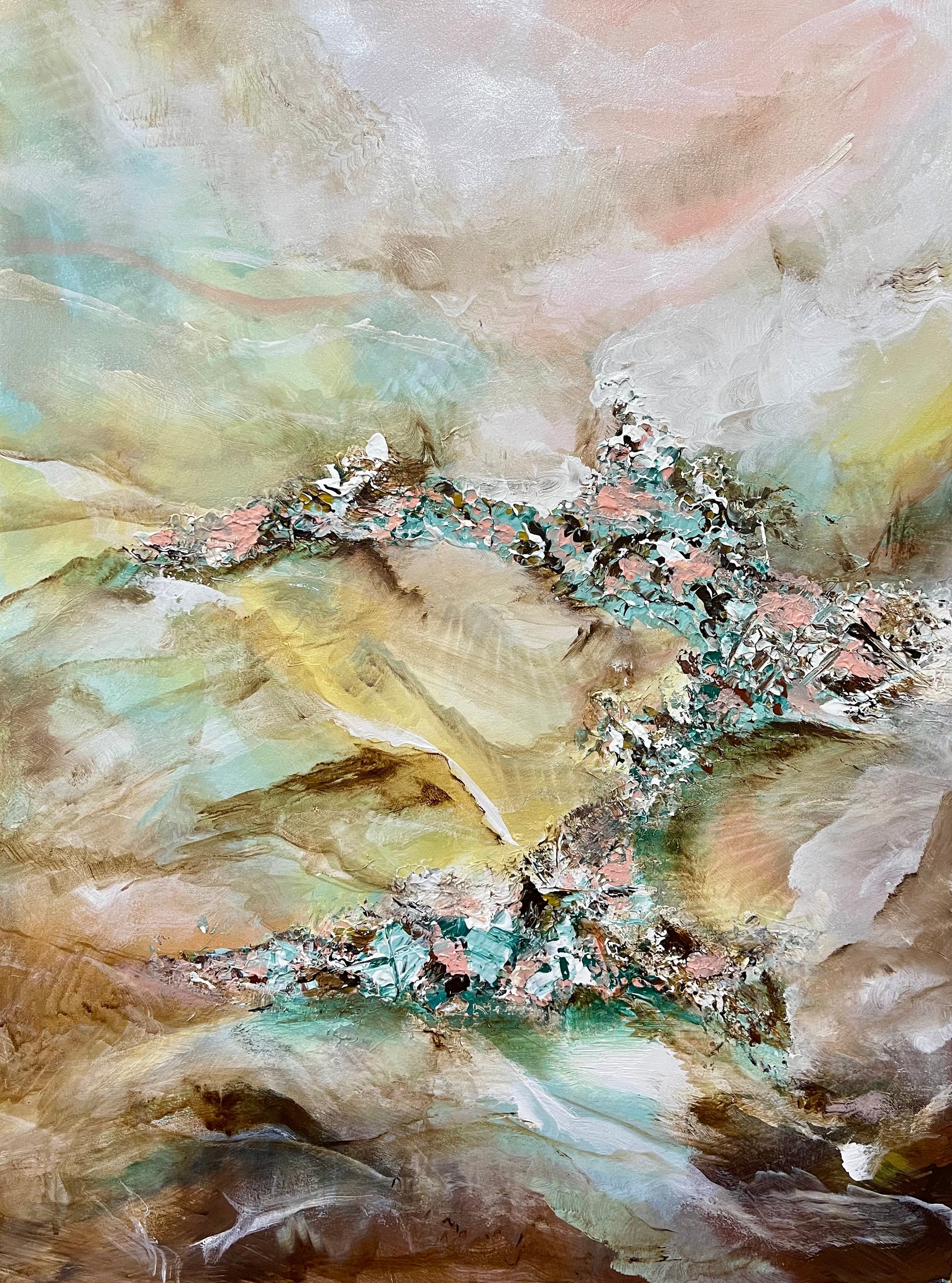 An abstract vision of a forgotten village emerging through pastel peach and amber. Soft mists drift across muted tones, evoking sacred stillness and memories suspended in time. The work invites quiet reflection, where beauty lingers in silence and every hue whispers of the past.