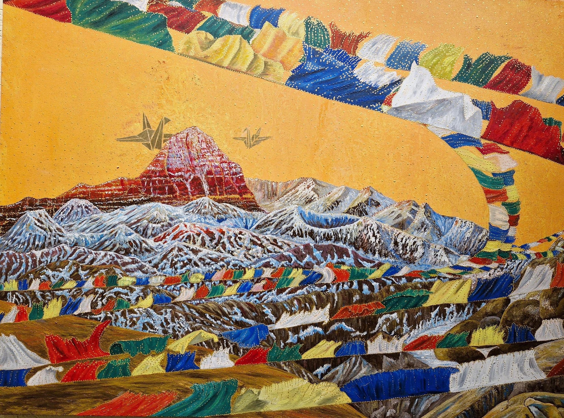 A mesmerizing journey into the serene beauty of the mountains, where majestic snow-clad peaks meet an endless sky of golden hues. Prayer flags dance in the wind, symbolizing hope, peace, and blessings carried across the vastness of nature. This artwork radiates the spirit of resilience, faith, and the interconnectedness of all life. Let this vibrant scene inspire tranquility and unity in your heart.